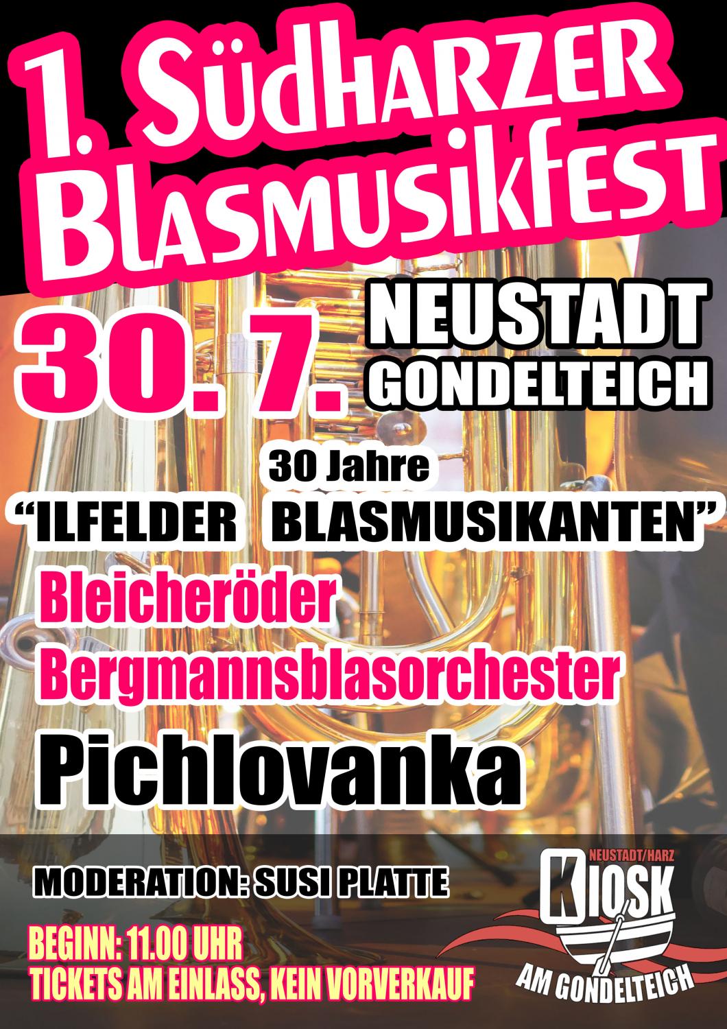 Wir präsentieren das 1. Südharzer Blasmusikfest am schönen Gondelteich in Neustadt.