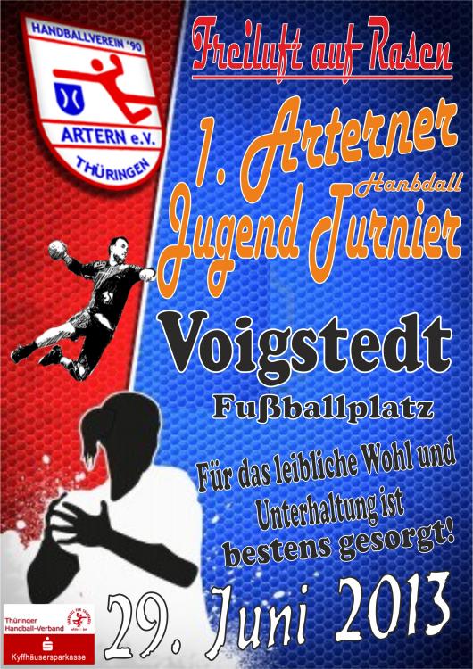 Der Arterner Handballverein gestaltet in diesen Jahr das erste Freiluft Handballturnier für den eigenen Nachwuchs. In drei Altersklassen spielen die Arterner Jugendmannschaften gegen Mannschaften im Umkreis auf dem Sportplatz in Voigstedt. Für das leibliche Wohl und Unterhaltung ist bestens gesorgt. Der HV 90 Artern würde sich freuen sie begrüßen zu dürfen!